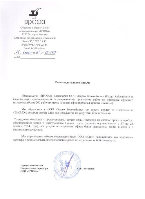 Издательство "ДРОФА" благодарит ООО "Карго Релокейшнс" (Cargo Relocations) за качественную организацию и безукоризненное проведение работ по перевозке офисного имущества (более 200 рабочих мест) в новый офис (включая архивы и мебель). Мы обратились к ООО "Карго Релокейшнс" по совету коллег из издательства "ЭКСМО" , которые уже не один год пользуются их услугами, и не пожалели. Сотрудники компании - профессионалы своего дела. Несмотря на сжатые сроки и пробки , обусловленные зимой и наступающим новым годом (переезд осуществлялся с 17 по 25 декабря 2014 года), все услуги по перевозке офиса были выполнены точно в срок и с надлежащим качеством. Мы определенно можем охарактеризовать ООО "Карго Релокейшнс" как надежного партнера и рекомендовать для выполнения работ по переездам любой сложности.